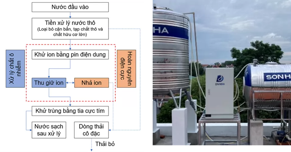 Chất lượng nước đầu ra đạt theo QCVN 01-1:2018/BYT đối với chất lượng nước sạch sử dụng cho mục đích sinh hoạt và có thể kiểm soát để đảm bảo QCVN 6-1:2010/BYT đối với chất lượng nước uống trực tiếp. Sơ đồ quy trình nguyên lý của máy DIVION được thể hiện trong Hình 1.