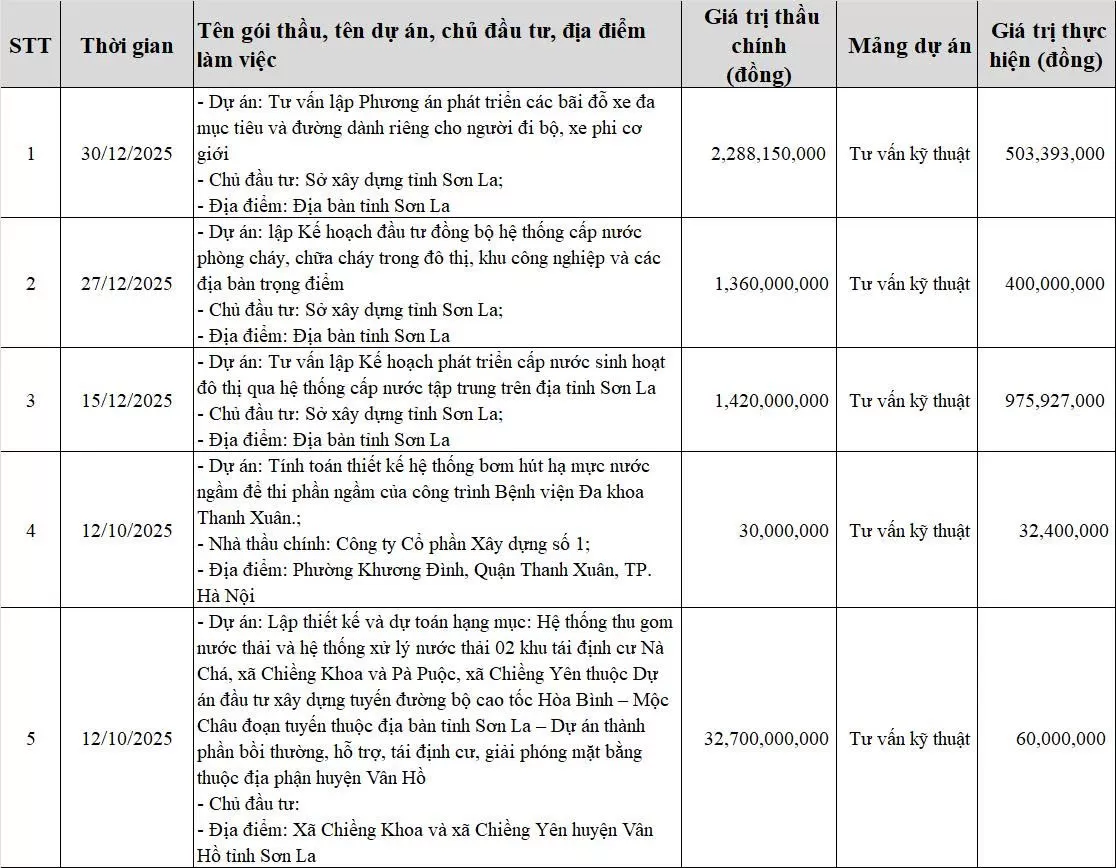 Với kinh nghiệm triển khai nhiều dự án trong lĩnh vực hạ tầng kỹ thuật đô thị và môi trường, nhà thầu đã tham gia thực hiện các nhiệm vụ tư vấn lập quy hoạch, khảo sát, thiết kế và xây dựng cơ sở dữ liệu chuyên ngành cho nhiều địa phương. Danh mục một số dự án, gói thầu tư vấn tiêu biểu mà nhà thầu đã thực hiện được trình bày trong bảng dưới đây.