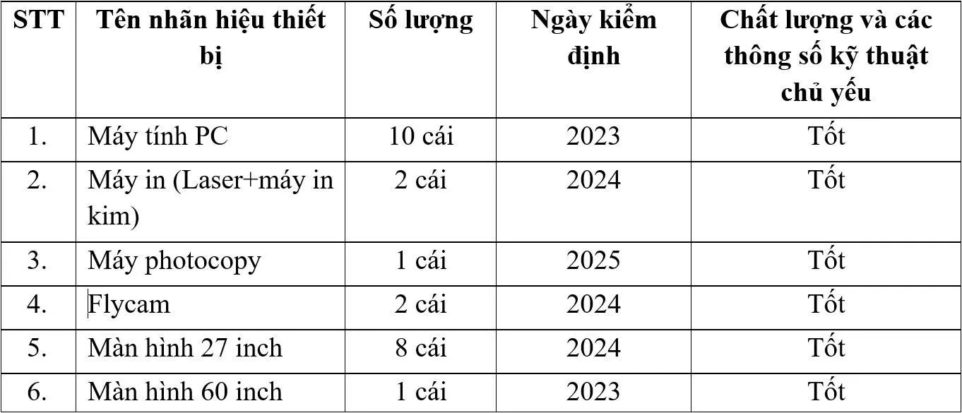 Nhà thầu có đầy đủ cơ sở vật chất và trang thiết bị văn phòng phục vụ công tác chuyên môn, bảo đảm đáp ứng yêu cầu triển khai các nhiệm vụ tư vấn. Danh mục các trang thiết bị chủ yếu của nhà thầu được trình bày trong bảng dưới đây.