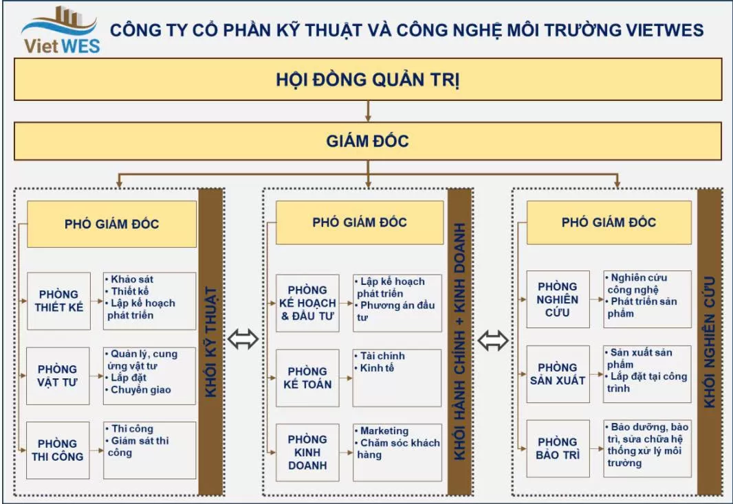 - Cơ cấu tổ chức của công ty Cổ phần Kỹ thuật và Công nghệ môi trường VietWES được tổ chức hoạt động và điều hành theo mô hình Công ty Cổ phần: