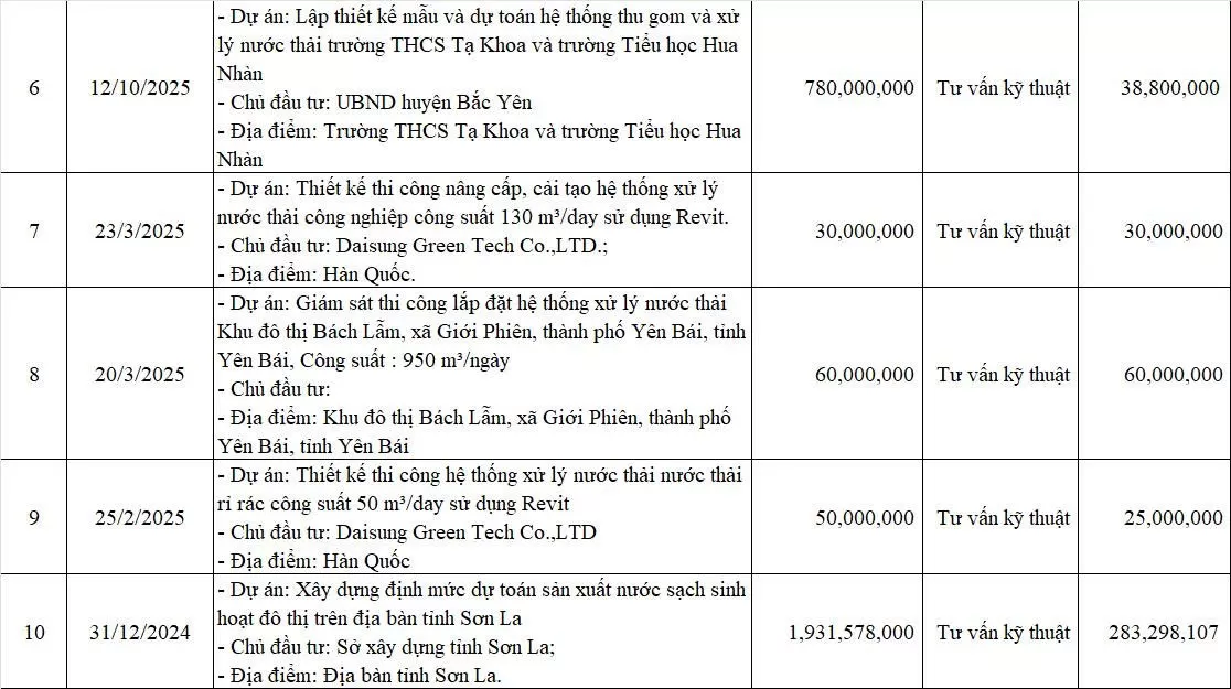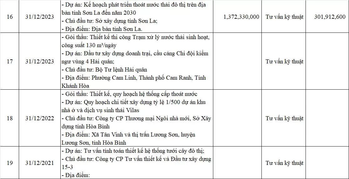 Với kinh nghiệm triển khai nhiều dự án trong lĩnh vực hạ tầng kỹ thuật đô thị và môi trường, nhà thầu đã tham gia thực hiện các nhiệm vụ tư vấn lập quy hoạch, khảo sát, thiết kế và xây dựng cơ sở dữ liệu chuyên ngành cho nhiều địa phương. Danh mục một số dự án, gói thầu tư vấn tiêu biểu mà nhà thầu đã thực hiện được trình bày trong bảng dưới đây.